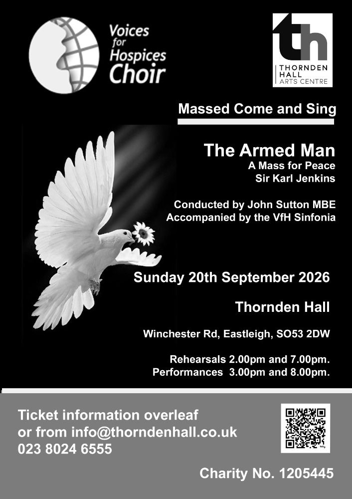 We will be again performing “The Armed Man- A Mass for Peace” by Sir Karl Jenkins. Given the continuing challenging times of peace throughout the world, it seems an almost necessary oevre for the 20th September 2026, given the hearfelt singing for acceptance of all faiths, colours, creeds and peace included in the movements.